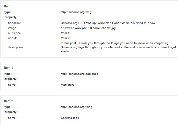 After you’ve marked up a page, make sure it is done properly by running it through Google’s rich snippet testing tool, which will show you a labeled list of all the marked-up content it finds on your page.